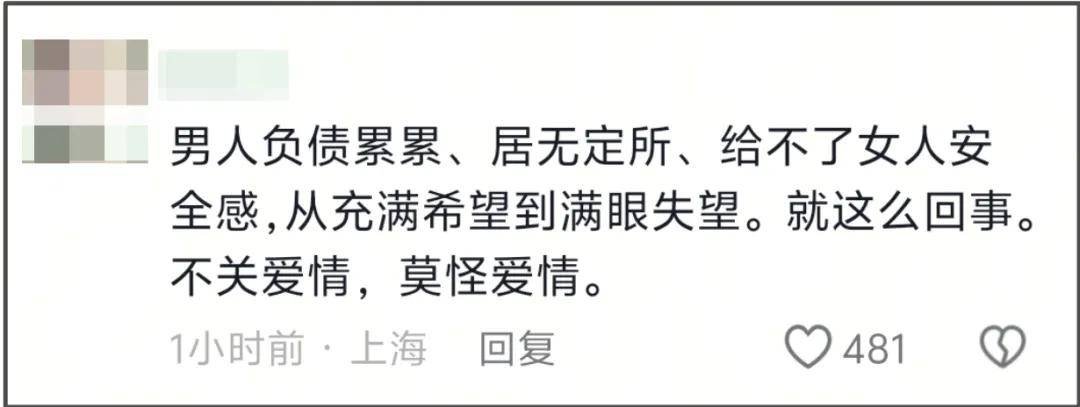 虽然李亚鹏和海哈金喜没有公开离婚原因,但明眼人都看得出二人婚姻问题所在,“男人负债累累、居无定所、给不了女人安全感。从充满希望到满眼失望。就这么回事,不关爱情,莫怪爱情。”