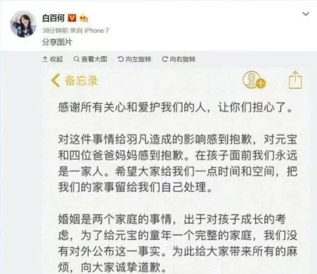 几天后,陈羽凡出面发声,称两人早在2015年就已经协议离婚,并宣布“无限期退出娱乐圈”。随即,白百何发文承认离婚。