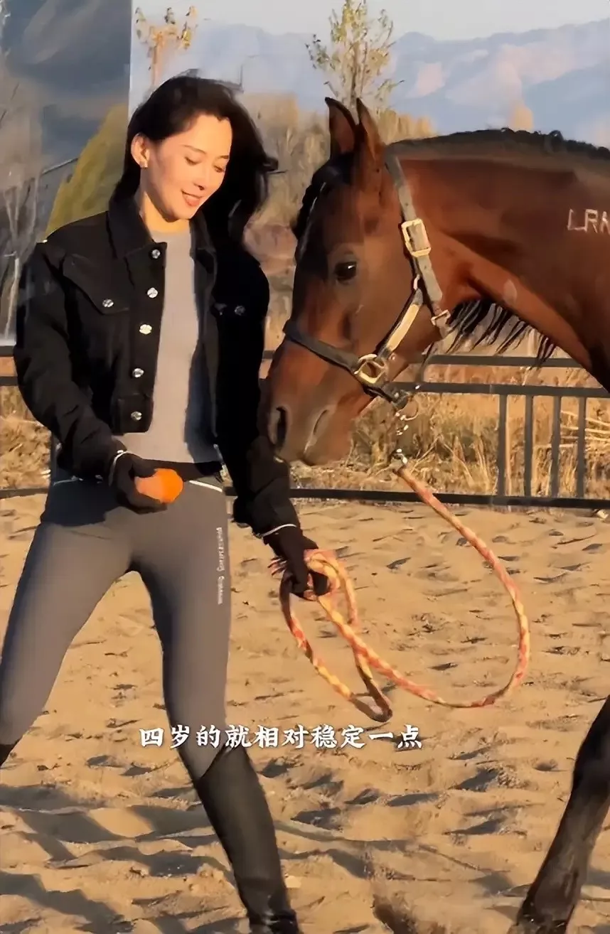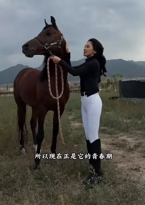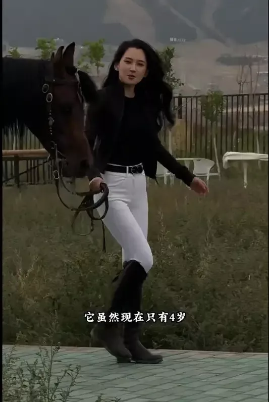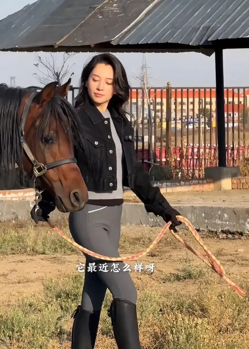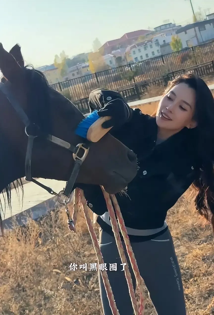她在新疆养了一匹马,还在网友的帮助下给它取了一个名字叫黑眼圈。大概是这匹马的眼圈总是黑黑的,网友就提议给它叫黑眼圈了。