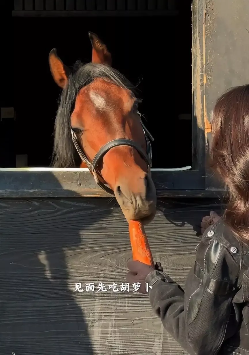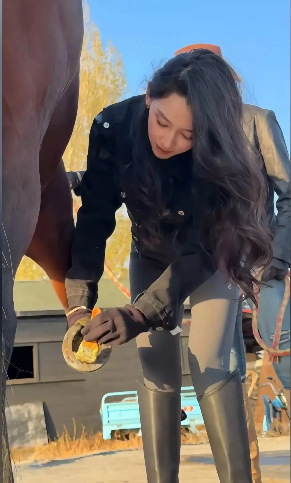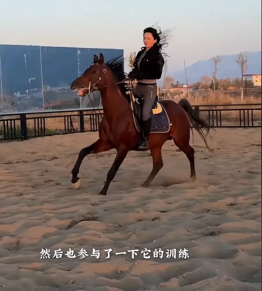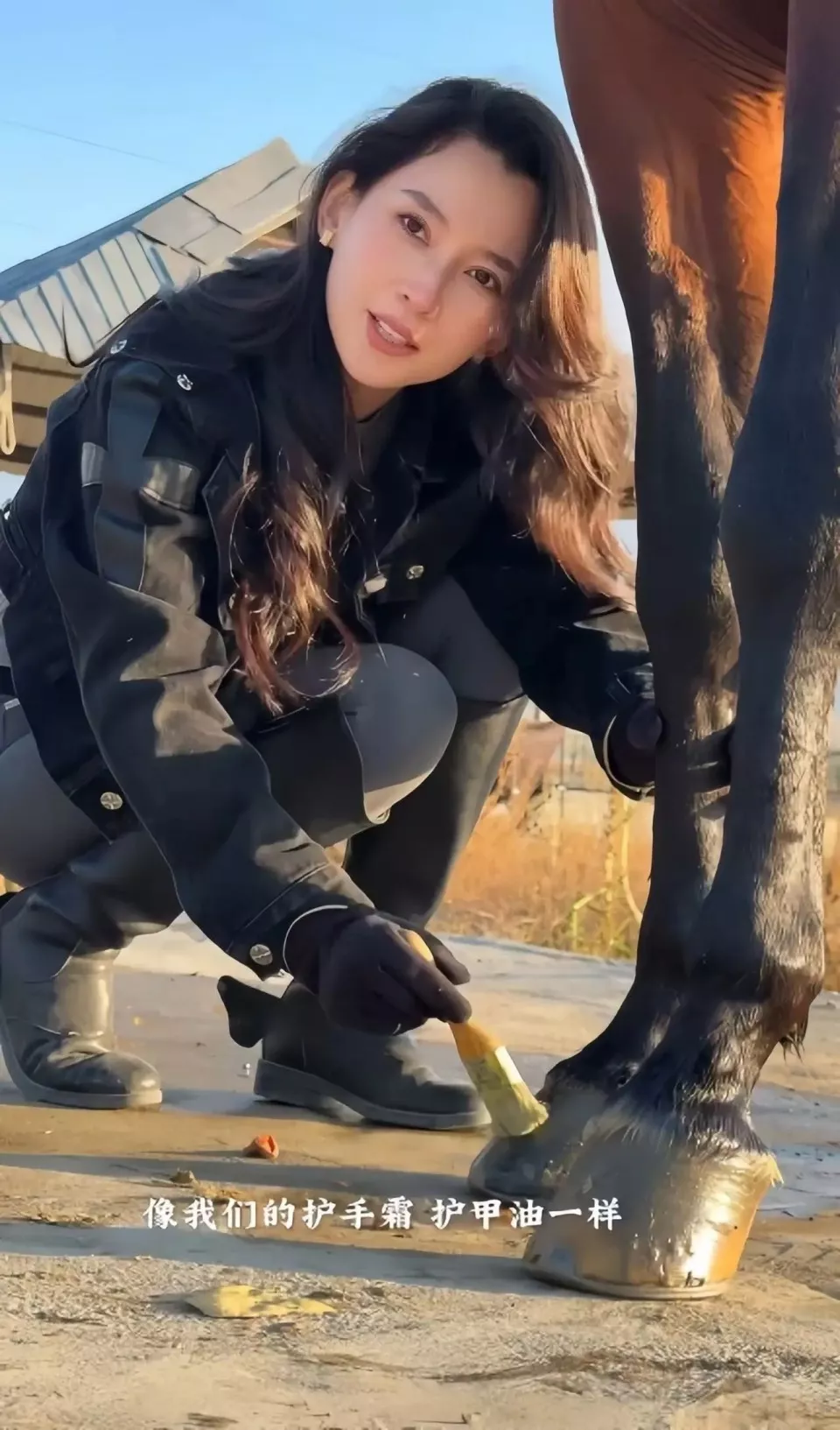 她在新疆养了一匹马,还在网友的帮助下给它取了一个名字叫黑眼圈。大概是这匹马的眼圈总是黑黑的,网友就提议给它叫黑眼圈了。