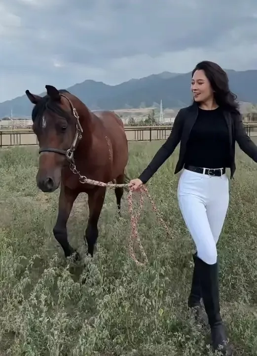森林本真是很温和大气,镜头里她牵着马、行走在草地上,画面又美又飒。森林北穿着紧身短上衣,白色紧身裤、还有马靴,很飒。