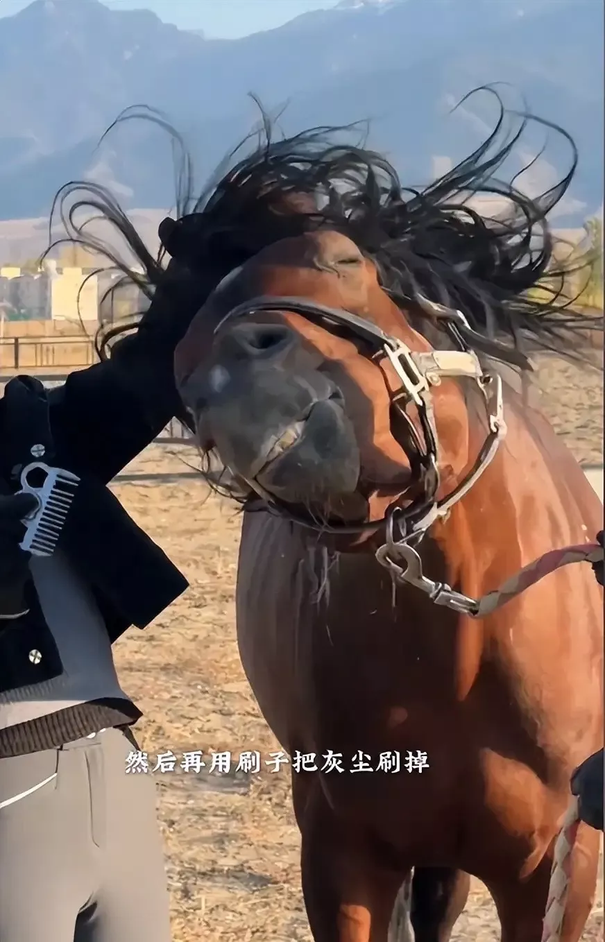 马儿身上大都是灰尘,给它清理的时候它一点都不抗拒,整体都是很享受的过程。森林北也是有经验,和马儿相处的很默契。