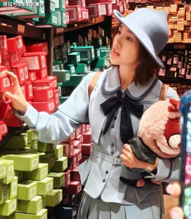 她身着一件雾霾蓝的纽扣上衣,这件上衣独具匠心,配有披肩小斗篷与收腰设计,再搭配同色的百褶半裙。海军蓝与藏蓝色的装饰条及配饰恰到好处地点缀其上,为整体造型赋予了丰富的层次感。为与这一身精妙的装扮相契合,她所佩戴的帽子亦是雾霾蓝色,而身上所背的背包则是一只造型独特的卡通小熊,软萌之中又透着几分暴力美感,尽显其时尚品味。