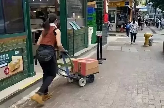 画面中,这个女孩经常推着货物在街上行走。