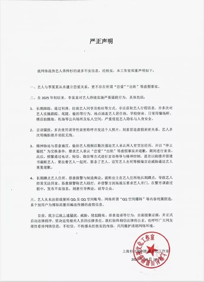 面对女方的爆料,今天一早,荣梓杉工作室就出来发声明,指控李禹熹是自己的极端粉丝,两人没有谈恋爱。他说李禹熹长期对自己跟踪、尾随、偷拍,还言语骚扰,对他造成了严重困扰,此外李禹熹还以跳楼等行径逼迫荣梓杉,对此工作室都已经搜集证据。