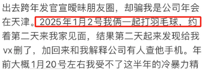 大家记住1月2日这个时间,再回看李禹熹昨天的爆料,她里面提到一个细节,两人1月2日一起打了羽毛球,这就对上了。