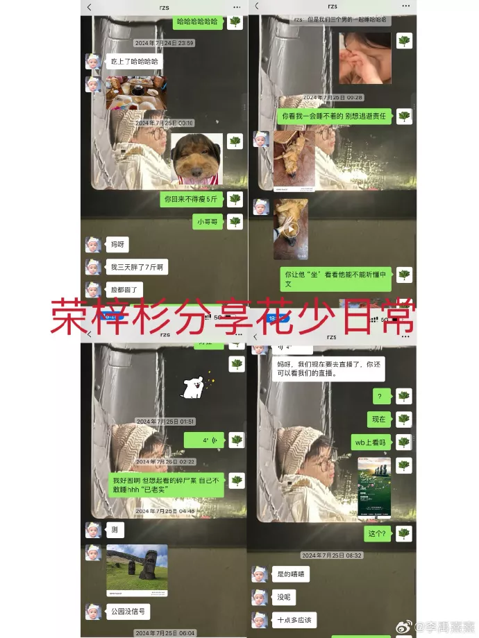 女方发的聊天记录很多,从开始荣梓杉加了自己,到后面荣梓杉去参加花少6和李禹熹分享的日常生活,都有。