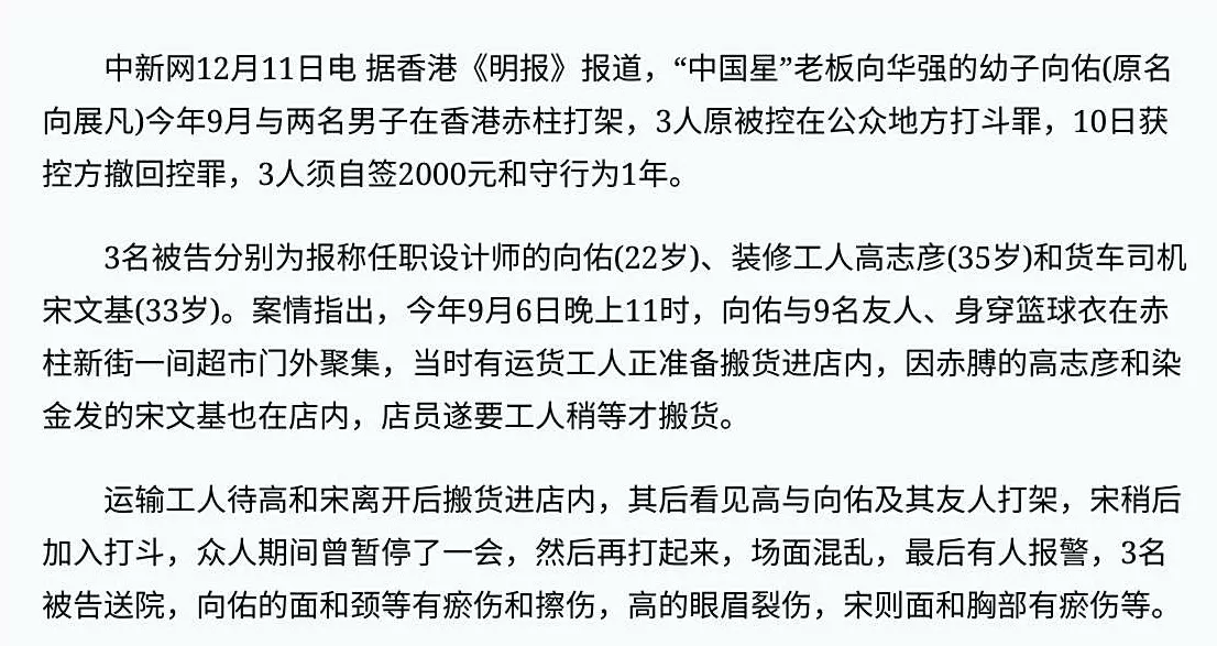 最后向佑被控袭击致造成身体伤害、刑事恐吓及普通袭击三项罪名,被法院判决入狱六个月。用向太自己的话说就是“他那个心态我不懂,他控制不了自己的脾气,打完人家还说我爸爸是谁”。