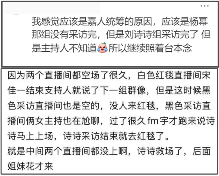 当然了,杨幂和刘诗诗的抢压轴风波没有后续,粉丝默认主办方统筹出了问题,时代姐妹花和刘诗诗分别接受采访,谁先结束谁先上,主持人能力不足不知道变通,没有现场应对能力只知道念稿子,总之就是主办方和主持人的错,才不是大明星的问题呢。