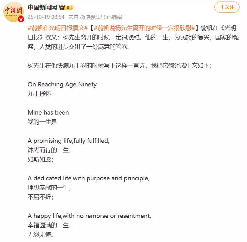 逝者已矣,杨振宁的离世让所有人感到悲痛,不过还是希望翁帆以及杨振宁的亲友们能够早日从失去亲人的痛苦中走出来。