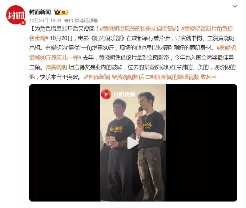 10月20日,电影《阳光俱乐部》在成都看片会上,主演黄晓明的身形变化成了全场焦点。为塑造片中“吴优”一角——一名心智仅8岁的特殊人群,他硬生生把自己从140斤吃到了168斤,增重28斤。而看片会现场的他又已瘦回那副“薄肌男神”模样,这波操作让网友直呼:“明星增减30斤跟玩儿似的!”
