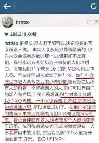 2012年前夕,韩流风靡一时,TAO作为EXO组合的成员出道,随后爆火。不过,团体大热并未带来高薪收入,再加上长期训练落下的伤病,以及队友陆续退团,TAO选择离开韩国SM娱乐有限公司,回国单干。