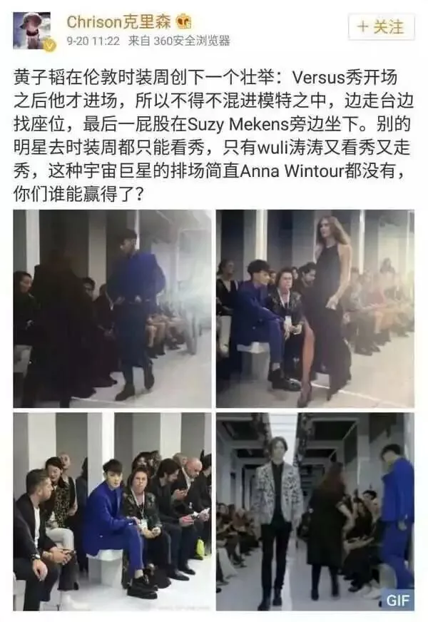 没过多久,他又在伦敦时装周闹下笑话。看秀迟到怎么办?wuli韬韬想到了绝佳办法,那就是混进模特队伍。黄子韬在T台上边走边提着裤子的松紧带,最后一屁股坐在著名时尚评论人Suzy