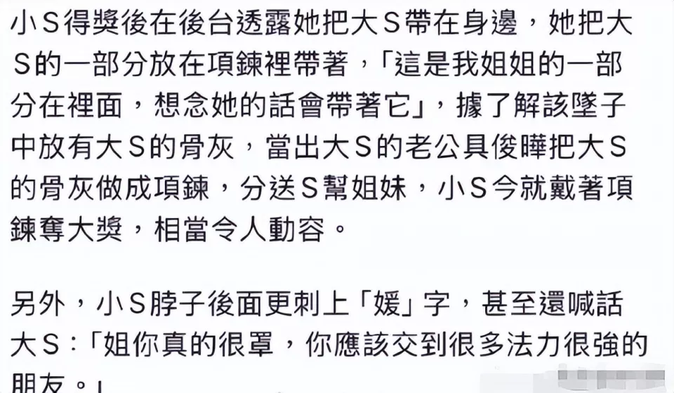 在接受媒体采访时,她还特意露出脖子上戴的项链,表示姐姐一直跟她在一起。原来她戴的这条项链是由具俊晔亲手设计,还放有大S的骨灰。