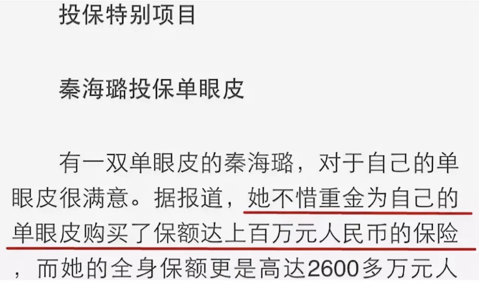 虽然因为容貌问题备受打击但是秦海璐也没想过要去整容什么的,而且她很爱惜自己单眼皮的个人特质,一度还给单眼皮投了上百万保险。
