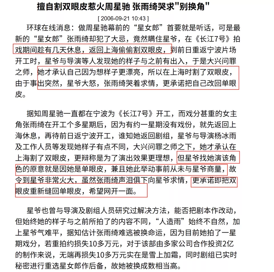 当时还传出周星驰要换角,张雨绮为了不被换掉承诺改回单眼皮。不过后来我们都知道周星驰没有换角,张雨绮也没改回单眼皮,电影里的她就是双眼皮。