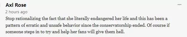 别再给她找借口了,她的确在威胁自己生命。自从监护期结束,她就一直有不稳定和不安全的行为。当然,如果有人介入,试图帮助,她的粉丝会猛烈抨击。