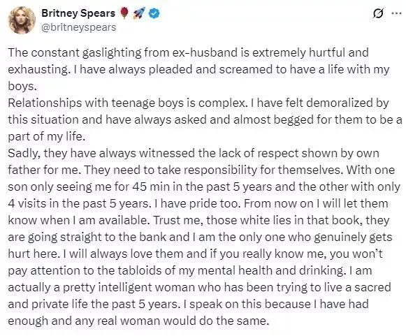 可悲的是,他们总是看到自己的父亲对我缺乏尊重。他们需要为自己负责。一个儿子在过去的5年里只看了我45分钟,另一个儿子在过去的5年里只看了我4次。我也有骄傲。从现在起,我会主动告知他们我什么时候有空。相信我,书里那些善意的谎言,会(变成金钱)进银行,而我是唯一一个真正受到伤害的人。我会永远爱他们,如果你真的了解我,你就不会关注说我心理健康和酗酒问题的小报。事实上,我是一个非常聪明的女人,在过去的5年里,我一直在努力过着神圣而私密的生活。我说这些是因为我受够了,任何一个真正的女人都会这样做。”