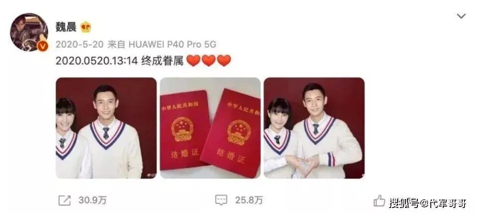2020 年 5 月 20 日 13 点 14 分,魏晨用自己微博的第 2000 条动态官宣结婚,配图是两人紧握的双手与结婚证,卡点
