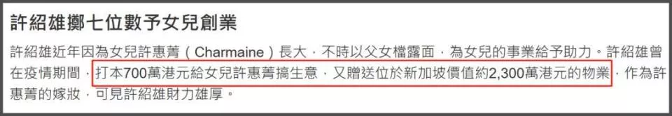 也不怪网友对他年近80岁还在娱乐圈打拼感到吃惊,许绍雄的家底不是一般雄厚,曾豪掷700万港币(人民币约641万)给女儿许惠菁做生意。