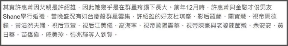 许惠菁和男友Shane结婚时,许绍雄更是送上位于新加坡价值2300万元的物业,来宾也基本上全是港圈大咖,影帝视后云集,看得出来许绍雄混圈这么多年,人缘确实很不错。