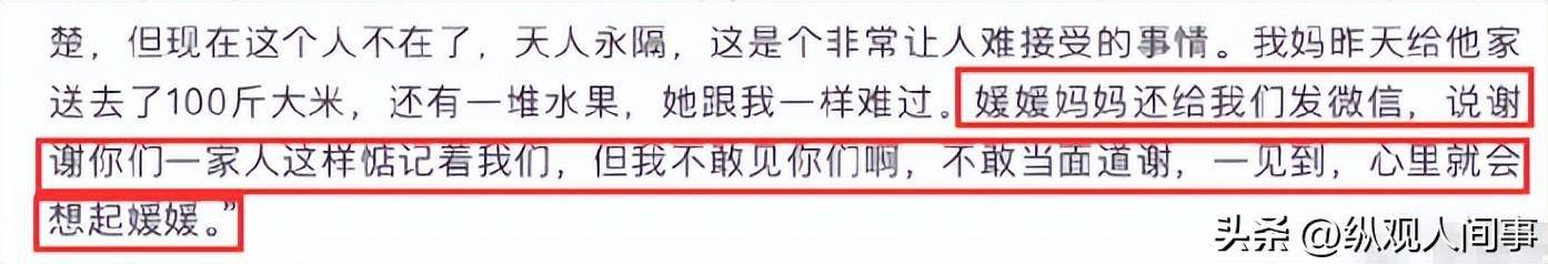 在蒋勤勤的访谈中,她曾说道:“媛媛妈妈不敢见人,她害怕一见到我们,就会想起女儿的脸庞”。