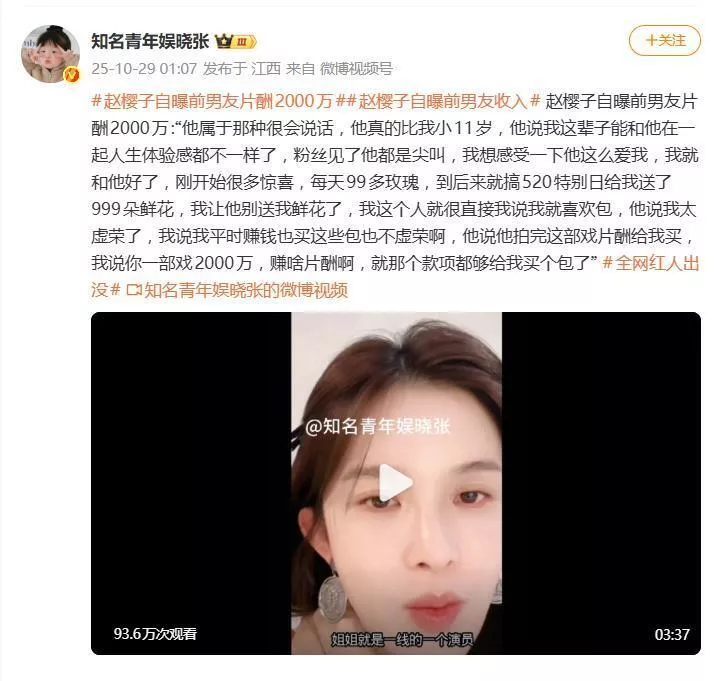 一句“一部戏片酬2000万”,让赵樱子再次成为舆论焦点。这次,她自曝了一位“小11岁一线男演员”前任的惊人收入,却让全网陷入了“猜谜”狂欢:这位凭借2025年暑期仙侠剧爆红、三字姓名、外貌出众的男主角,究竟是谁?