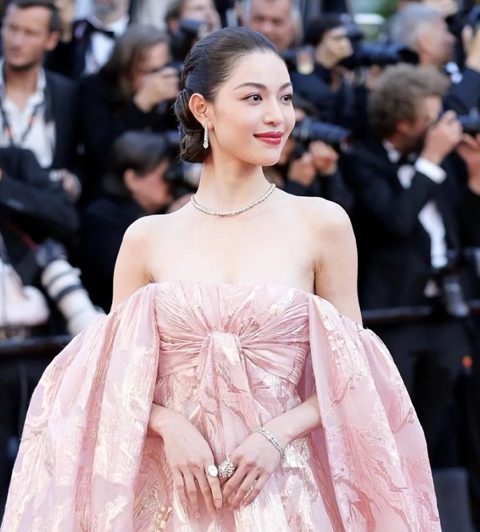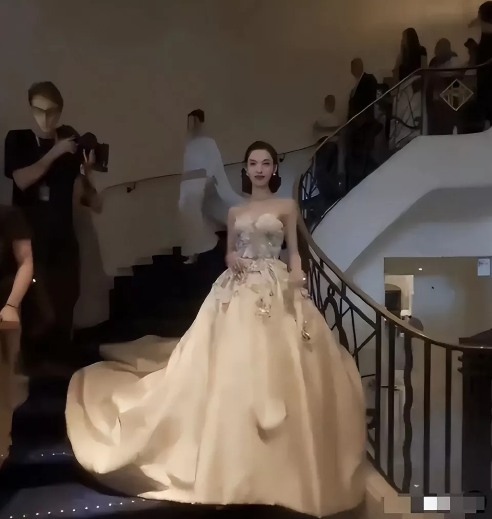 去年戛纳电影节,她穿大裙摆礼服堵在楼梯口拍照。