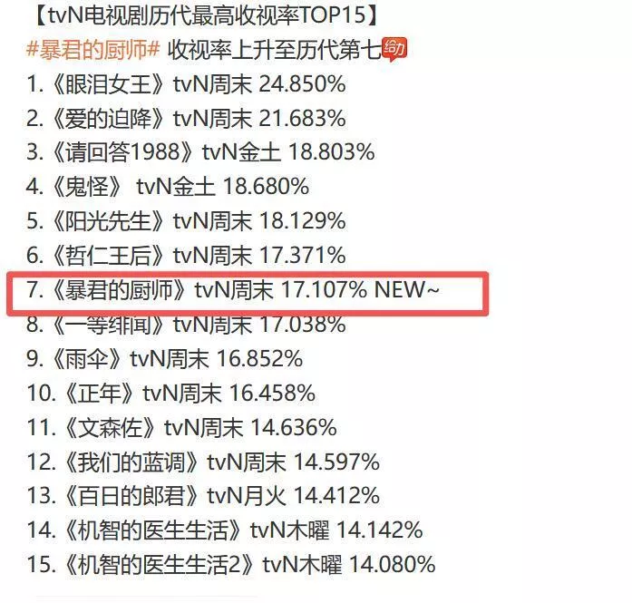 今年她又拍摄了一部大爆剧《暴君的厨师》,在韩国打破多项收视记录,大结局时的收视率位列tvN历代收视第7名,成绩喜人。