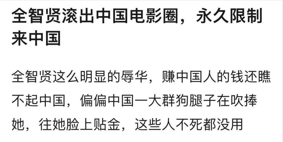 《暴风圈》被部分观众指责辱华,有几句台词还是出自全智贤之口,她也因此被网友抵制,代言方面受到影响,还被要求滚出中国电影圈,不要再过来挣钱。