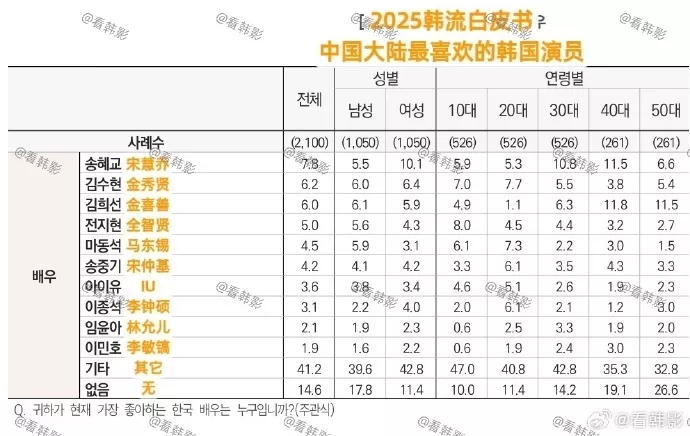 近日,2025韩流白皮书发布,“中国人最喜欢的10位韩国演员”榜单出炉,榜单上有几个人的名字让人意外,先跟巴塞君一起来看看具体都有谁。