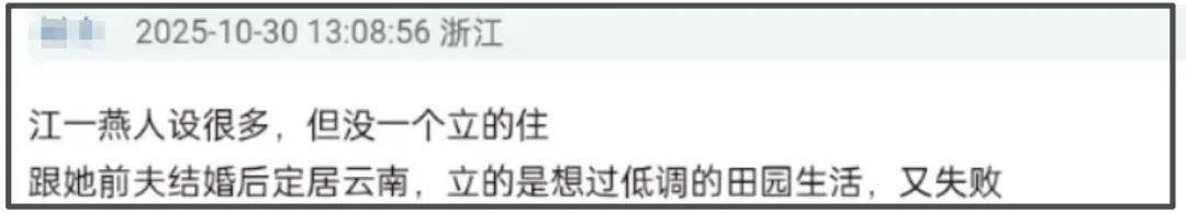 不过这样的生活也画上句号,用江一燕自己的话来说,这些年事业上没什么好的机会,生活上也结束了自己的婚姻。或许当年她觉得能通过立人设在娱乐圈稳住热度,但是人设没一个能立得住不说,之前想过上悠哉的田园生活也失败了。