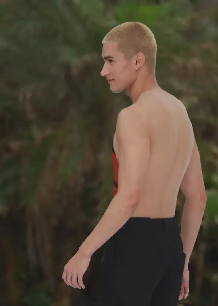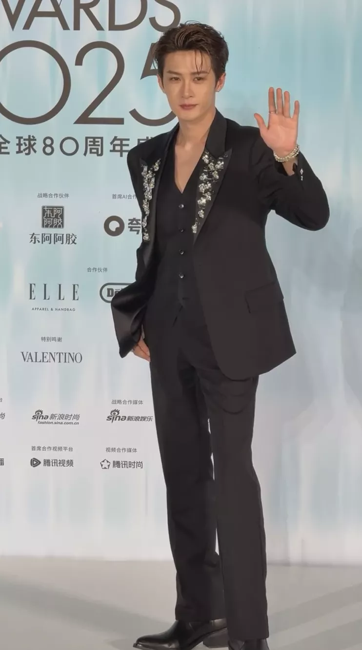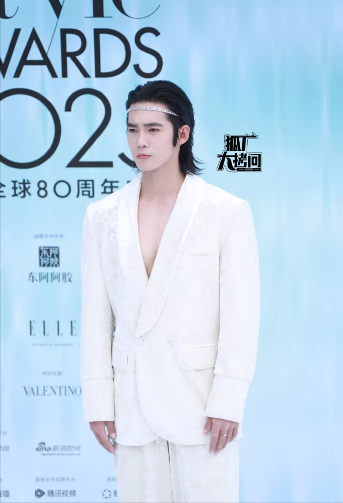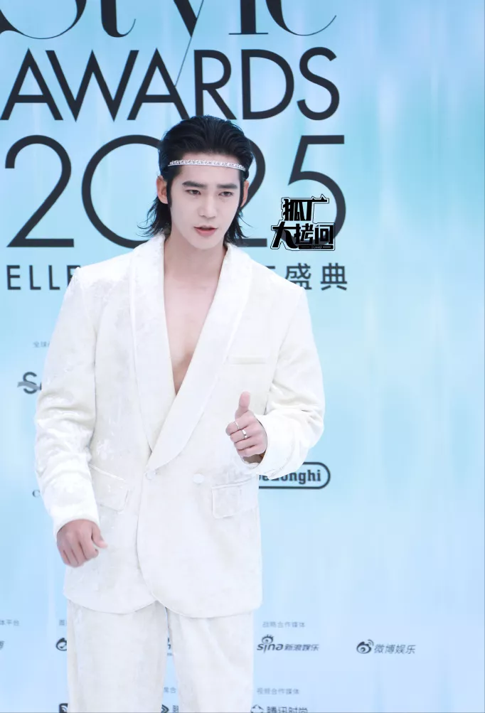 于适一身白色丝绒套装似白马王子,没有内搭真空上镜,若隐若现的胸肌过于吸睛,湿发背头造型潇洒不羁,一如既往地帅。