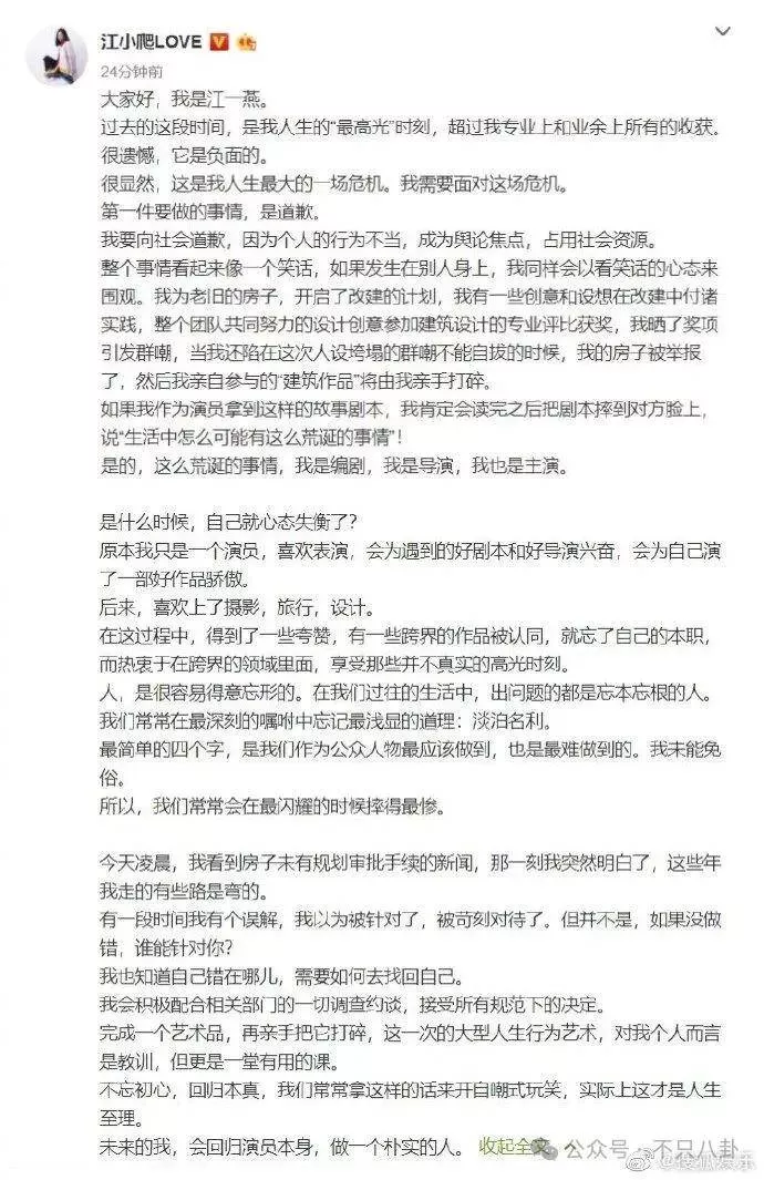 江一燕立马发文道歉,表示会配合调查约谈,未来回归演员本身,不搞有的没的了