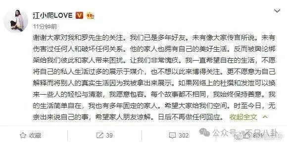 罗红终于忍不下去了,发微博澄清自己和江一燕只是朋友。(其实这时,江一燕很可能已经和赵汉唐恋爱了)