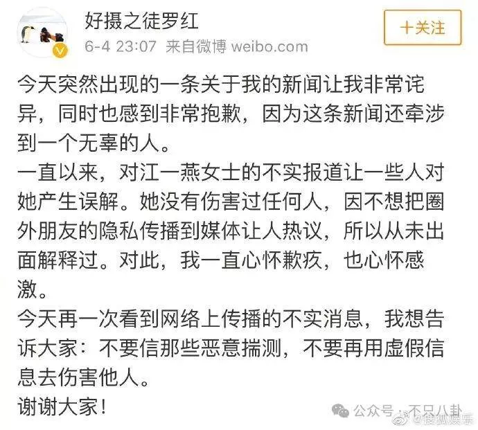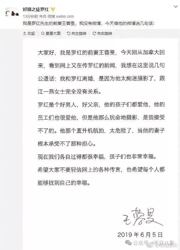 最重要的是,罗红的前妻王蓉旻发声,指出她和罗红离婚是因为男方太痴迷摄影,与江一燕无关。