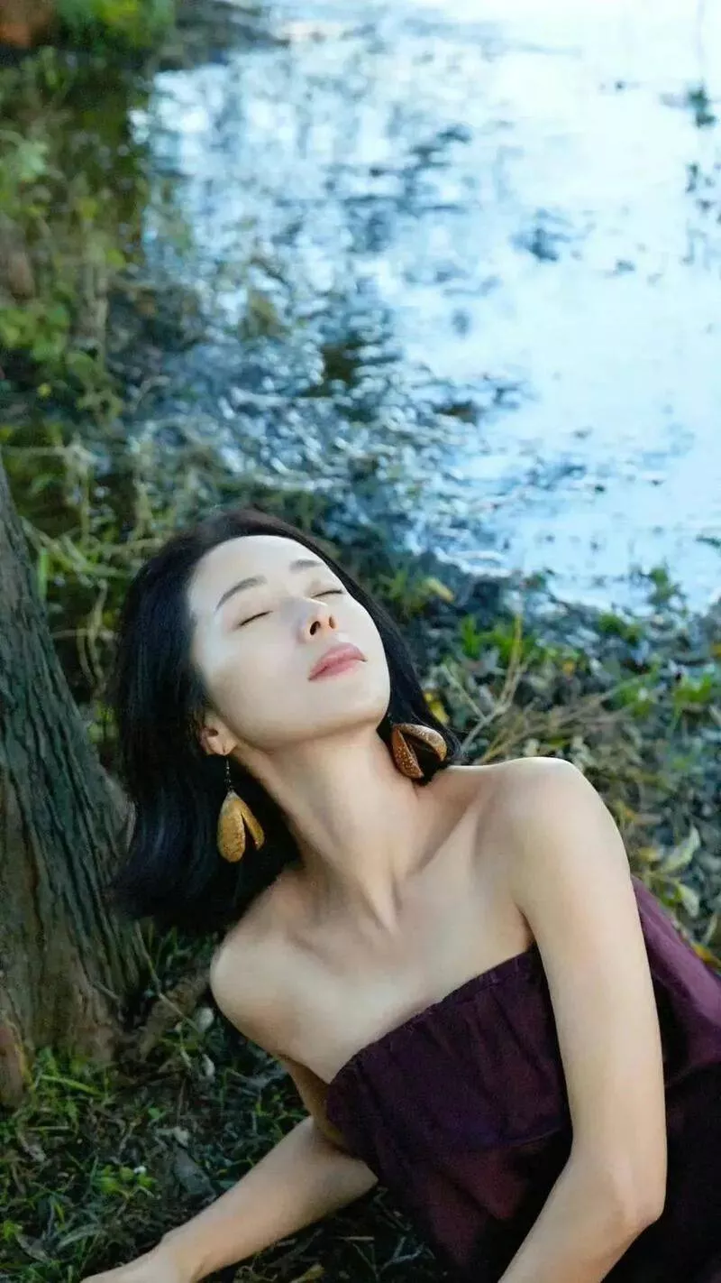 江一燕穿着黑色抹胸衣裙,她躺在树下,俏脸甜美可人,闭目养神很惬意,露出白皙的香肩和手臂,肌肤娇嫩如雪,曼妙的身材曲线,绝对性感撩人!