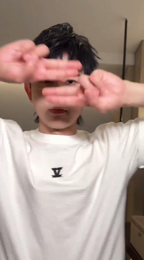 他上身穿着一件普通的白色短袖,胸口处有着一个很小的黑色刺绣图案,看着像是品牌的标志。