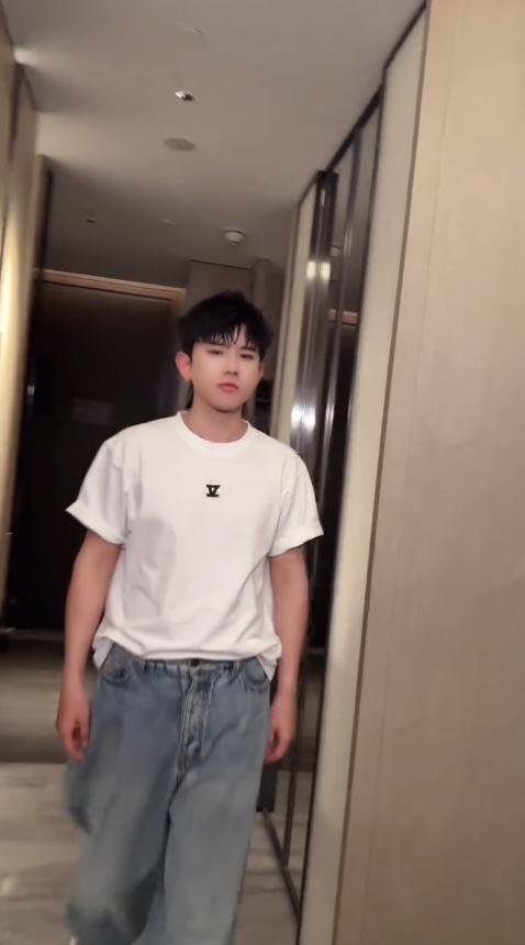 张先生是真的很喜欢青春感的穿搭,依旧在下身搭配了一条水洗牛仔裤,短袖的下摆扎在裤子里。