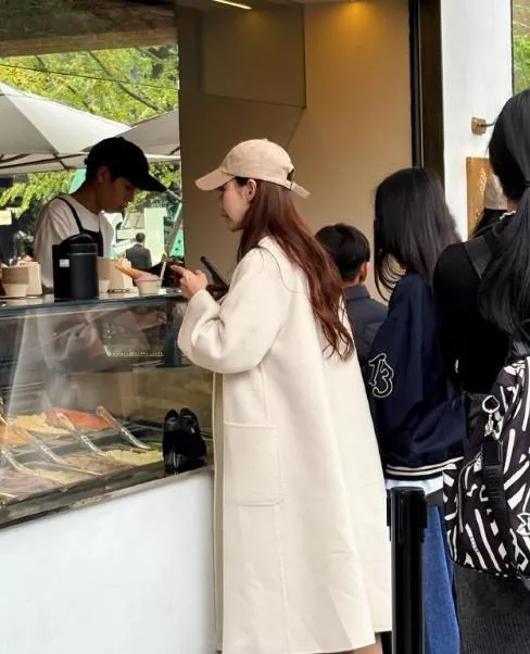 她穿着白色大衣,戴着棒球帽,捂得很严实。