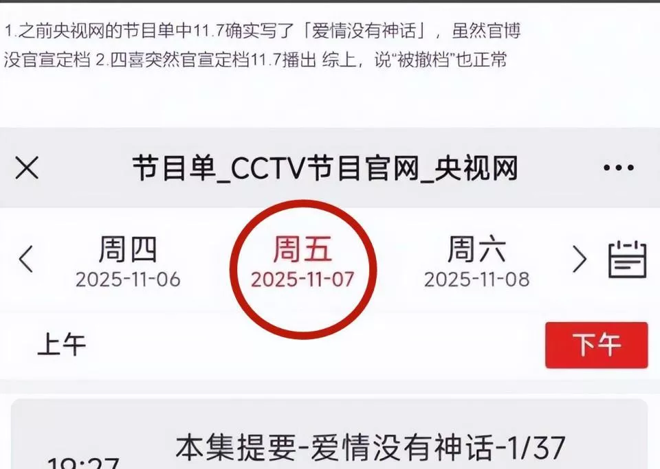 11月3日,央视八套节目单悄然变更:原定11月7日播出的《爱情没有神话》消失,由童瑶、蒋欣主演的《四喜》紧急接档。
