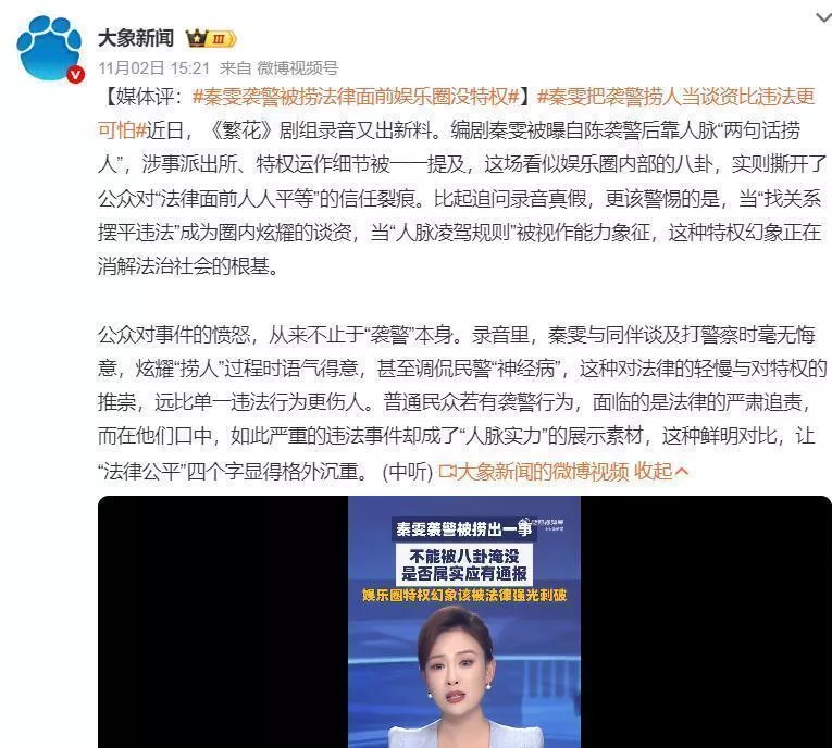 网友迅速扒出对比案例:普通网红袭警被拘10天,而秦雯却能“喝茶走人”。