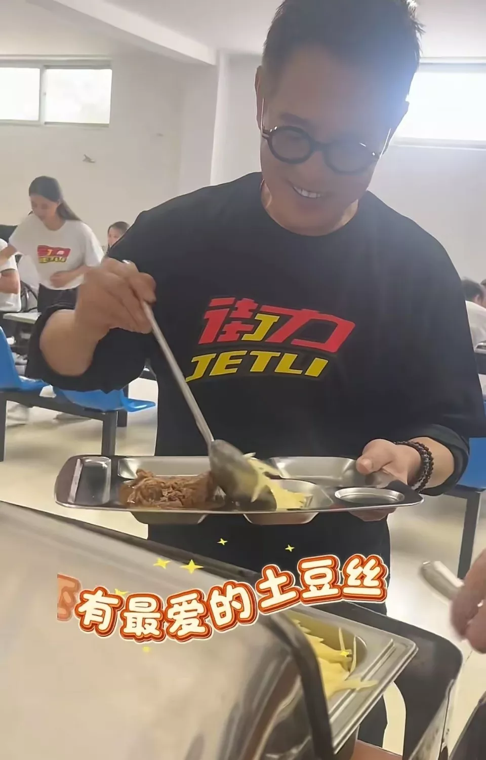 和学员们在一起吃饭时,李连杰自己去拿着餐盘去打饭,里面有他喜欢吃的土豆丝,还有炖排骨,看起来荤素搭配很均衡。