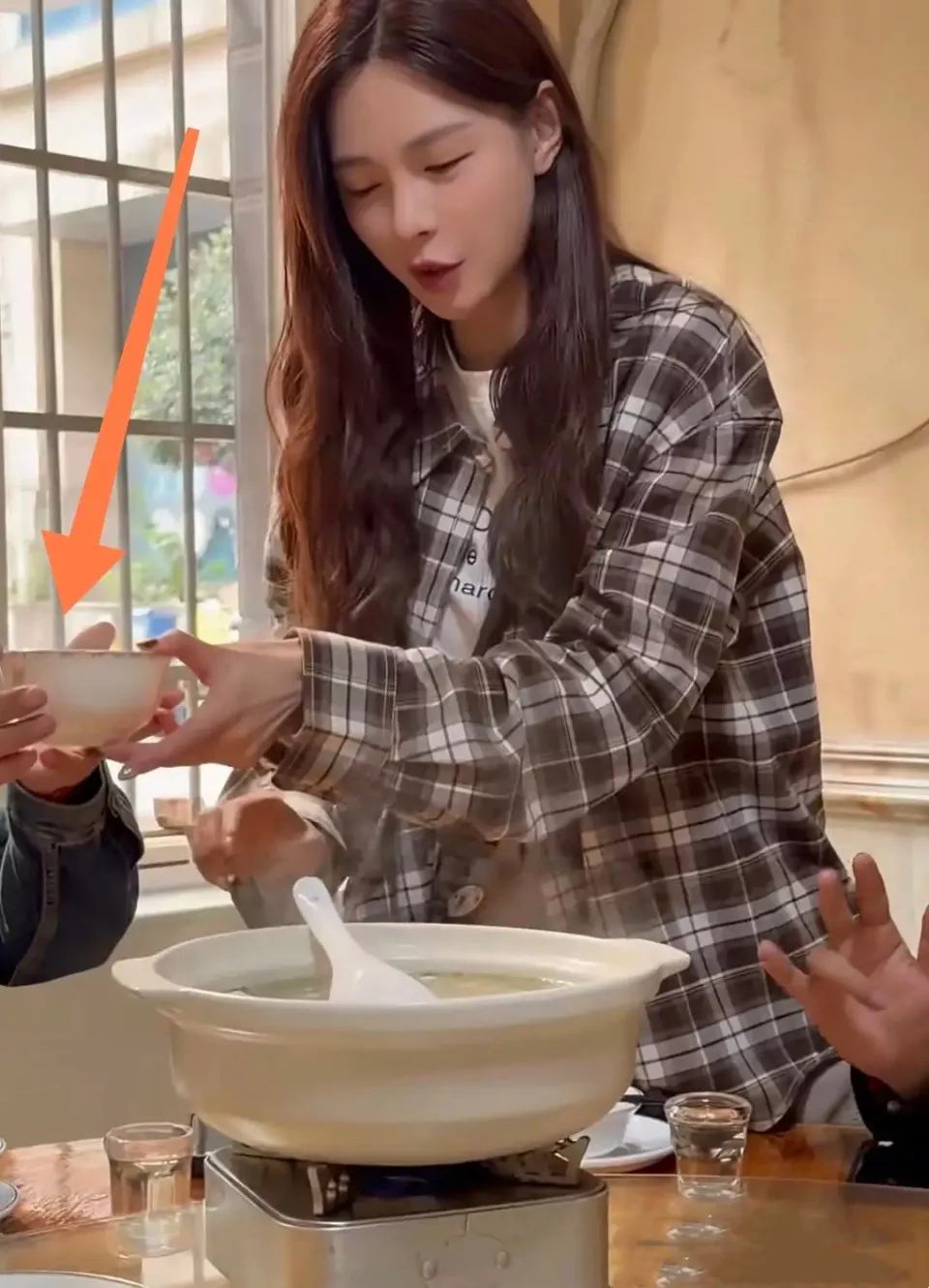 上菜之后,沈梦辰也很照顾大家。她先给汪涵盛了一碗汤,然后还忙着照顾其他的客人。在餐桌上,还看到了倒了酒的白酒杯。