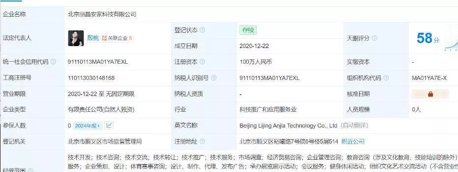 天眼查数据显示,殷桃名下的科技公司注册在江苏无锡,主营影视后期制作。