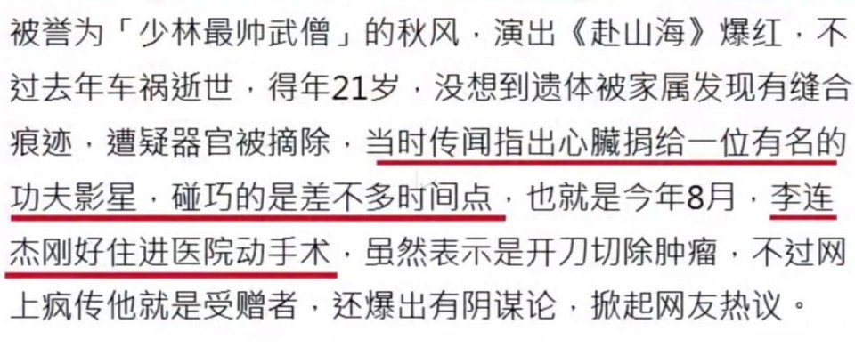 有谣言称他在8月住院时“换了心脏”,舆论发酵之后,有人添油加醋,声称他移植了武僧的心脏续命,还有人把已故少林弟子的故事硬生生拼进他的手术经历。