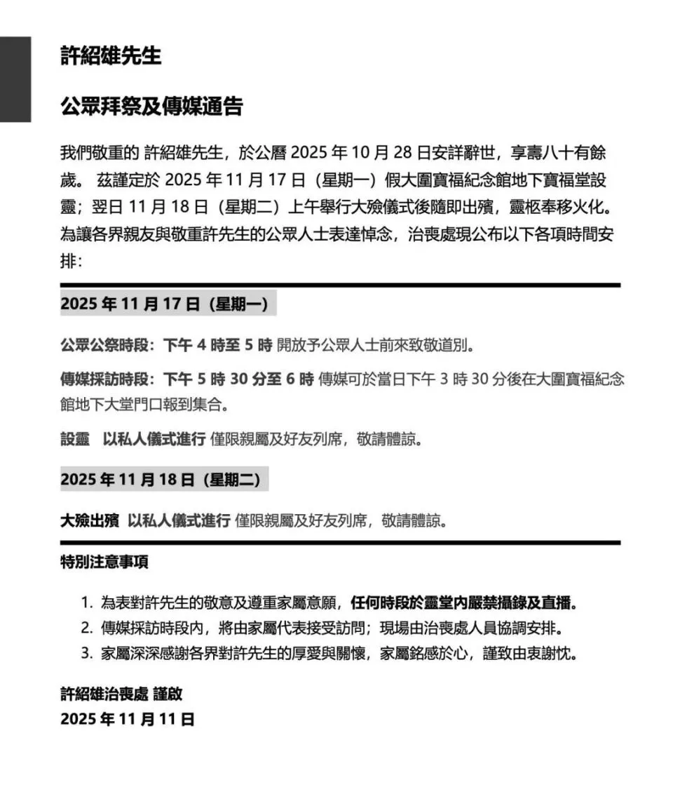 帖文附上了“许绍雄先生公众祭拜及传媒通告”。通告称,“我们敬重的许绍雄先生,于公历2025年10月28日安详辞世,享寿八十有余岁”。兹谨定于2025年11月17日(星期一)在香港大围宝福纪念馆地下宝福堂设灵;翌日11月18日(星期二)上午举行大殓仪式后随即出殡,灵柩奉移火化。