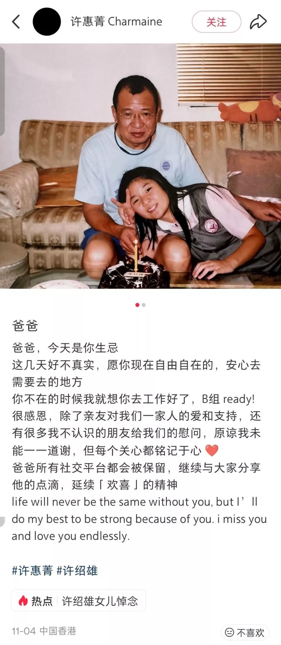 今天(11月11日)傍晚,许绍雄女儿许惠菁通过社交媒体发文称:“感谢大家的关心和温馨留言。知道网上有支持爸爸的朋友们安排了来香港跟他告别,我们一家都很感恩大家对他的爱护。再次感谢大家对我爸爸的爱和支持。他永远在我们心中。”