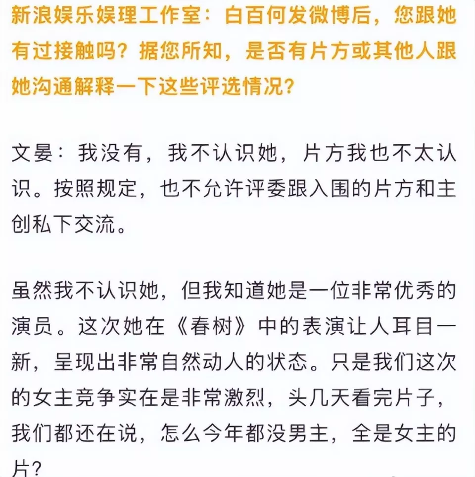 但文晏导演亲自出来辟谣,强调奖项不是某个人运作就能获得的,本人也不认识白百何,不存在针对一说。