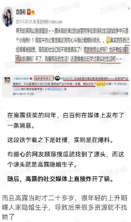 其实白百何不是第一次干这种事,早年间还曝光过高露隐婚,导致人家在事业上升期受到影响,很多年都不温不火。